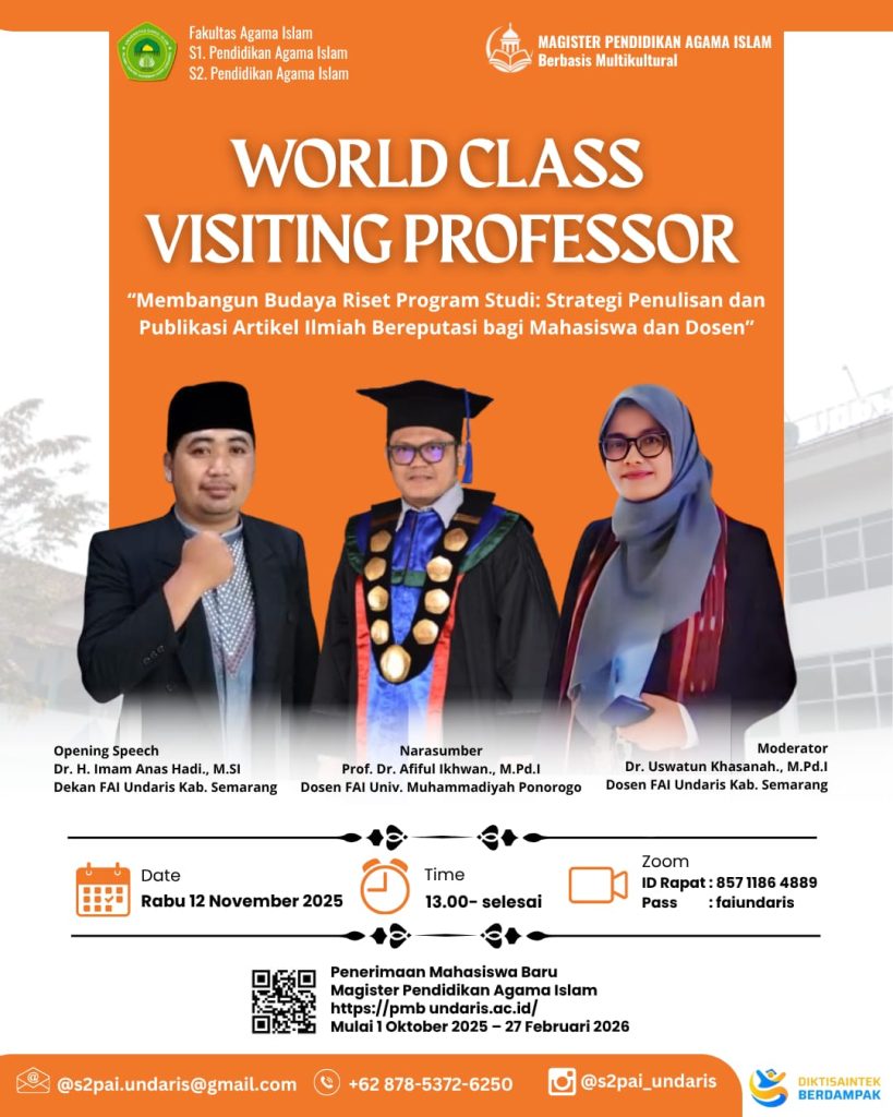 Fakultas Agama Islam (FAI) Universitas Darul Ulum Islamic Centre Sudirman (UNDARIS) Kabupaten Semarang kembali menghadirkan kegiatan World Class Visiting Professor sebagai bagian dari upaya penguatan budaya riset dan publikasi ilmiah di lingkungan akademik.