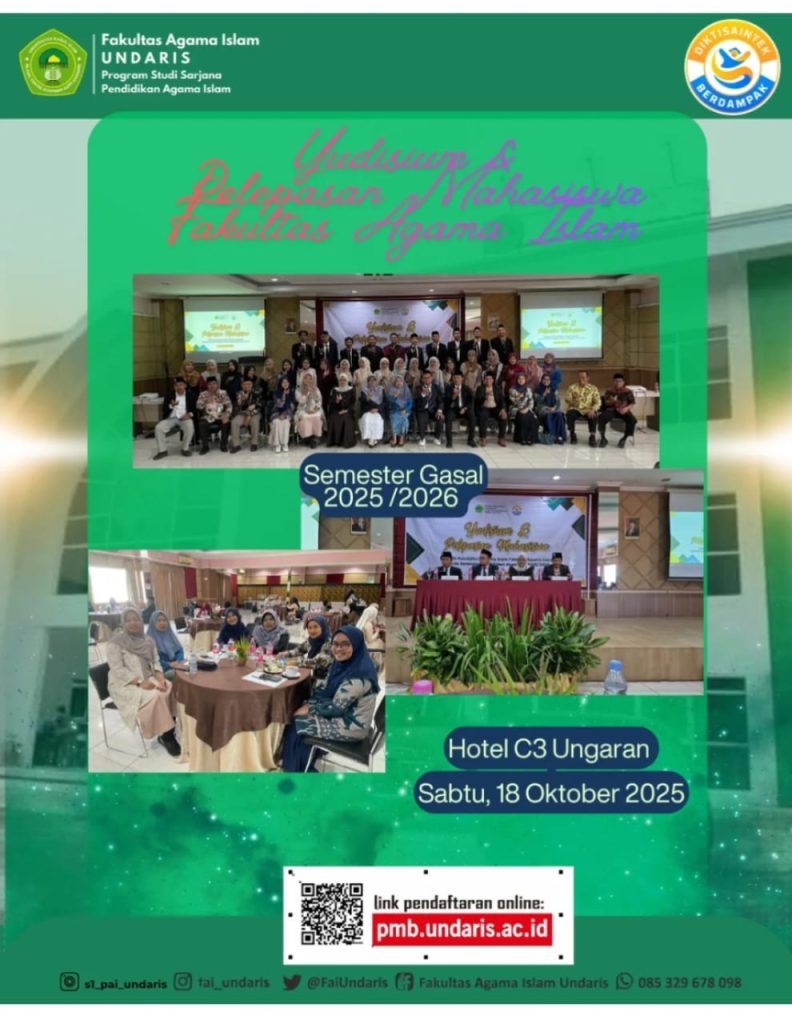 Fakultas Agama Islam Universitas Darul Ulum Islamic Centre Sudirman (UNDARIS) menggelar acara Yudisium dan Pelepasan Mahasiswa Semester Gasal Tahun Akademik 2025/2026 pada Sabtu, 18 Oktober 2025, bertempat di Hotel C3 Ungaran.